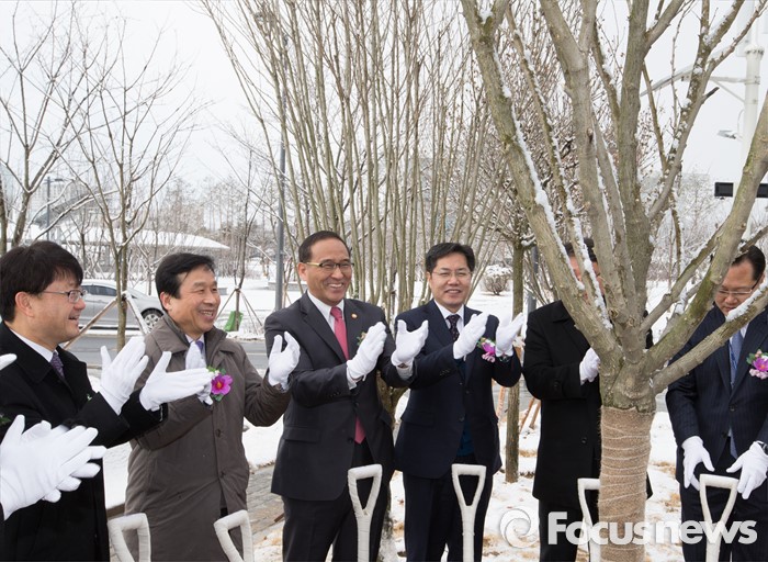 (세종=포커스뉴스) 홍윤식 행정자치부 장관이 29일 오전 세종시 어진동 대통령기록관 전시관 입구에 마련된 무궁화정원 개장식에서 시삽을 마치고 박수를 치고 있다.