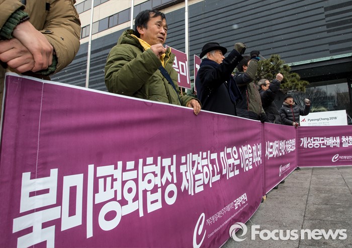 (서울=포커스뉴스) 29일 오후 서울 종로구 주한 미국대사관 옆에서 코리아연대 회원들이 '북미평화협정 체결 및 키리졸브훈련 반대'를 주장하는 구호를 외치고 있다.