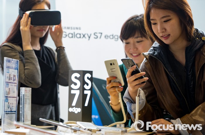(서울=포커스뉴스) 29일 오전 서울 종로구 올레스퀘어에 마련된 갤럭시S7 사전체험존에서 직원들이 갤럭시S7과 S7엣지를 살펴보고 있다.