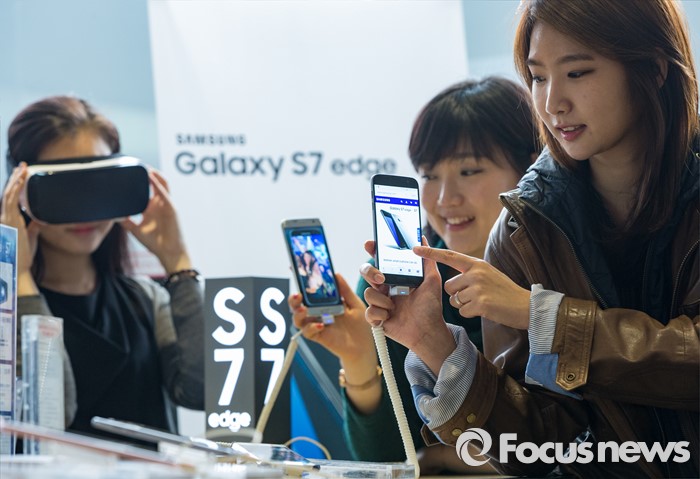 (서울=포커스뉴스) 29일 오전 서울 종로구 올레스퀘어에 마련된 갤럭시S7 사전체험존에서 직원들이 갤럭시S7과 S7엣지를 살펴보고 있다.