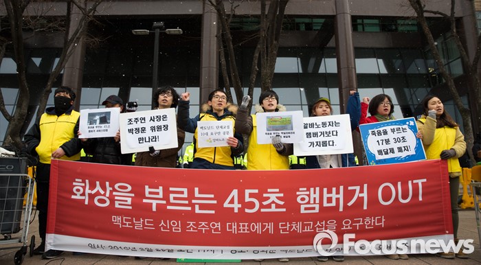 (서울=포커스뉴스) 29일 오전 서울 종로구 한국맥도날드본사 앞에서 알바노조 조합원들이 '45초 햄버거, 17분 30초 배달제 폐지' 등 10대 안건을 들고 단체교섭을 요구하는 구호를 외치고 있다.