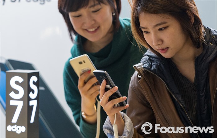 (서울=포커스뉴스) 29일 오전 서울 종로구 올레스퀘어에 마련된 갤럭시S7 사전체험존에서 직원들이 갤럭시S7과 S7엣지를 살펴보고 있다.