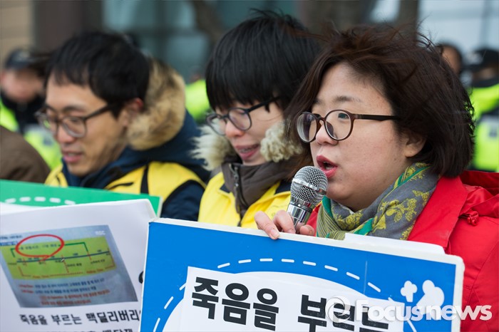 (서울=포커스뉴스) 29일 오전 서울 종로구 한국맥도날드본사 앞에서 알바노조 조합원들이 '45초 햄버거, 17분 30초 배달제 폐지' 등 10대 안건을 들고 단체교섭을 요구하는 기자회견을 하고 있다.