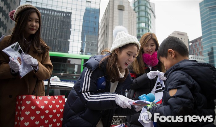 (서울=포커스뉴스) 3·1절을 하루 앞둔 29일 오전 아이돌걸그룹 '다이아'가 서울 강남역 앞에서 태극기 나눔행사를 하고 있다.