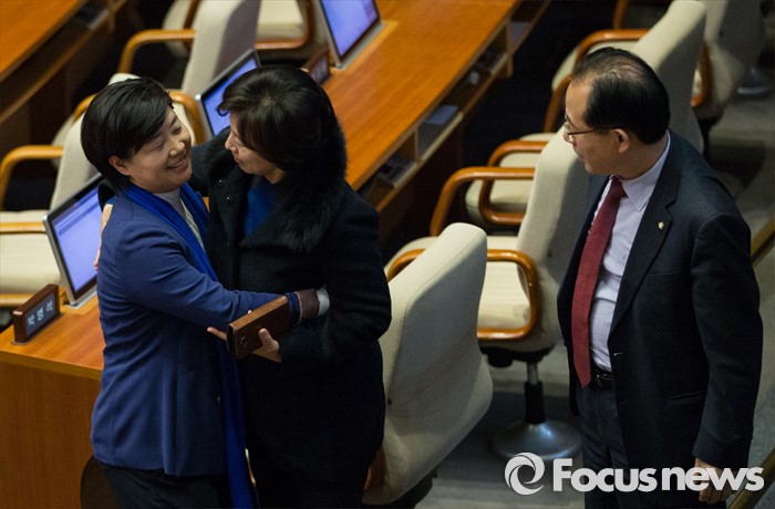 (서울=포커스뉴스) 테러방지법 직권상정에 반발해 야당이 무제한 토론(필리버스터)를 일주일째 진행하며 총 135시간을 돌파한 29일 오후, 서영교 더불어민주당 의원이 서울 여의도 국회 본회의장에서 토론을 마친 후 동려 의원들의 격려를 받고 있다.