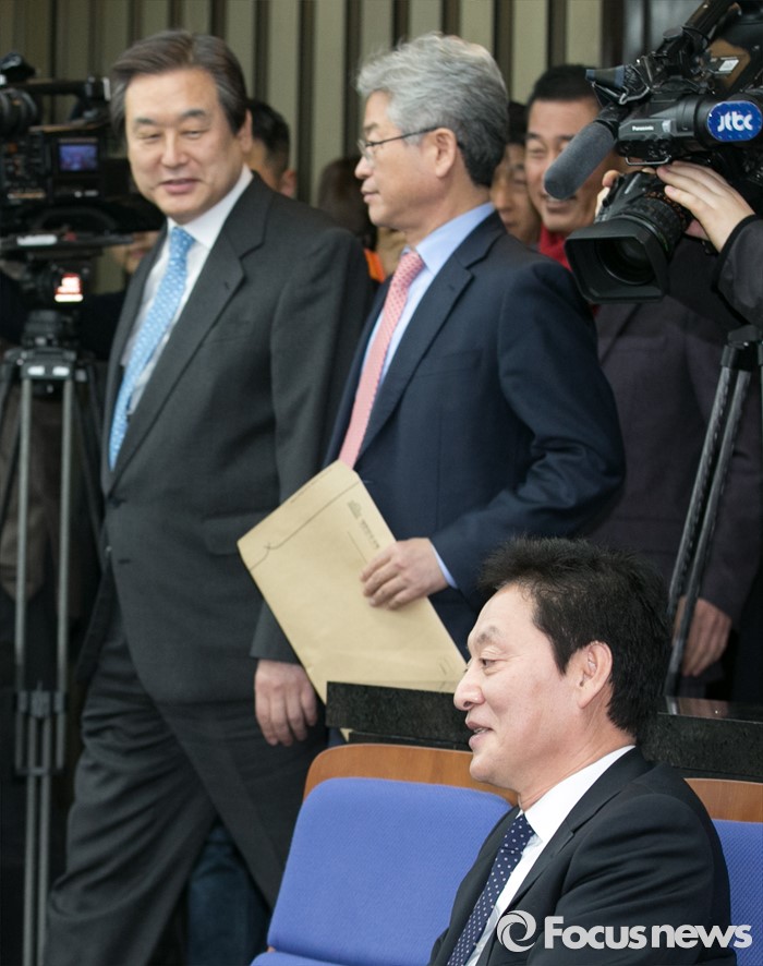 (서울=포커스뉴스) '공천 살생부' 관련 논란을 받고 있는 정두언(오른쪽) 새누리당 의원이 29일 오후 서울 여의도 국회에서 열린 의원총회에 참석해 동료 의원들과 대화하고 있는 모습 뒤로 김무성(왼쪽) 대표와 이철우 의원이 참석하고 있다. 정 의원은 지난 주말 한 언론 인터뷰에서 김무성 대표에게서 현역 의원 40여명의 '살생부' 이야기를 들었다고 전한 바 있다.