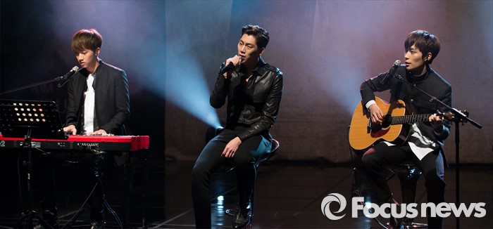 (서울=포커스뉴스) 29일 오후 서울 강남구 일지아트홀에서 신인 보이그룹 크나큰이 데뷔 쇼케이스에서 열창을 하고 있다. 왼쪽부터 정인성, 김유진, 오희준.