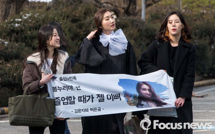 (서울=포커스뉴스) 29일 오후 서울 서대문구 이화여자대학교에서 열린 2015학년도 전기 학위수여식에 참석한 졸업생이 친구들의 축하 현수막과 함께 발걸음을 옮기고 있다.