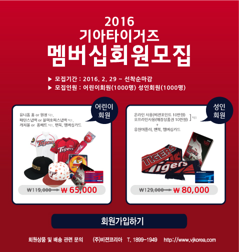 어린이회원은 5세부터 13세 어린이를 대상으로 하며 가입비는 6만5000원이다. KIA 유니폼과 모자, 캐치볼(폼 배트 중 택일), 2016시즌 팬북 등을 기념품으로 선사한다. 14세 이상을 대상으로 한 성인회원 가입비는 8만원이다. 온·오프라인 상품 매장에서 모두 사용할 수 있는 10만원 상당의 포인트, 응원 머플러, 팬북 등이 제공된다.