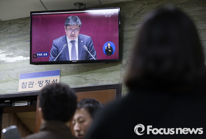 (서울=포커스뉴스) 테러방지법 직권상정에 반발해 야당이 무제한 토론(필리버스터)를 일주일째 진행하며 총 135시간을 돌파한 29일 오후 서울 여의도 국회 본회의장에서 토론에 참여한 최원식 국민의당 의원의 발언하는 모습이 회의장 입구 앞 모니터로 보이고 있다.