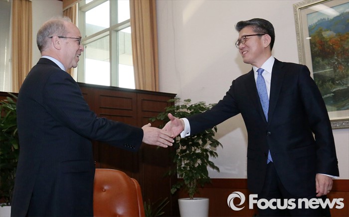 차관보= 김형진 현 기획조정실장북핵 6자회담 우리 측 수석대표가 되는 한반도평화교섭본부장(차관급)으로 김홍균(외시 18회) 외교부 차관보가 29일 새롭게 임명됐다. 사진은 2월 26일 오후 서울 종로구 외교부 청사에서 대니얼 러셀(왼쪽) 미국 국무부 동아시아태평양담당 차관보와 악수하는 김홍균 외교부 차관보. 2016.02.26 양지웅 기자