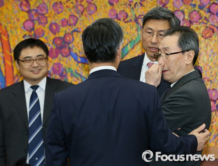 (서울=포커스뉴스) 우다웨이 북핵6자회담 중국 측 수석대표가 29일 오후 서울 종로구 세종로 외교부청사에서 윤병세 외교부 장관을 기다리며 참석자들과 이야기를 나누고 있다.