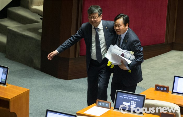 (서울=포커스뉴스) 테러방지법 직권상정에 반발해 야당이 무제한 토론(필리버스터)를 일주일째 진행하며 총 140시간을 돌파한 29일 오후, 서울 여의도 국회 본회의장에서 토론에 참여한 최원식 국민의당 의원이 발언을 마친 후 다리를 절며 퇴장하고 있다.