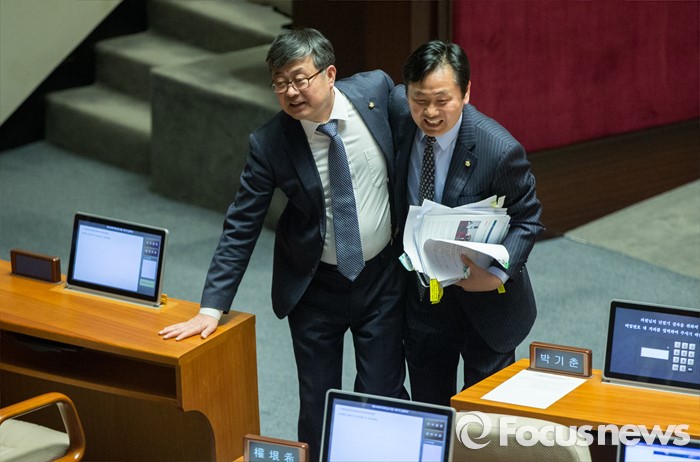 (서울=포커스뉴스) 테러방지법 직권상정에 반발해 야당이 무제한 토론(필리버스터)를 일주일째 진행하며 총 140시간을 돌파한 29일 오후, 서울 여의도 국회 본회의장에서 토론에 참여한 최원식 국민의당 의원이 발언을 마친 후 다리를 절며 퇴장하고 있다.