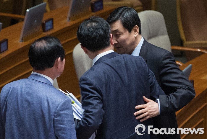 (서울=포커스뉴스) 테러방지법 직권상정에 반발해 야당이 무제한 토론(필리버스터)를 일주일째 진행하며 총 140시간을 돌파한 29일 오후 서울 여의도 국회 본회의장에서 토론에 참여한 최원식 국민의당 의원이 발언을 마친 후 이종걸 더불어민주당 원내대표의 격려를 받으며 퇴장하고 있다.