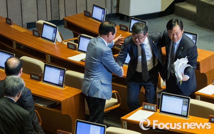 (서울=포커스뉴스) 테러방지법 직권상정에 반발해 야당이 무제한 토론(필리버스터)를 일주일째 진행하며 총 140시간을 돌파한 29일 오후, 서울 여의도 국회 본회의장에서 토론에 참여한 최원식 국민의당 의원이 발언을 마친 후 다리를 절며 퇴장하고 있다.