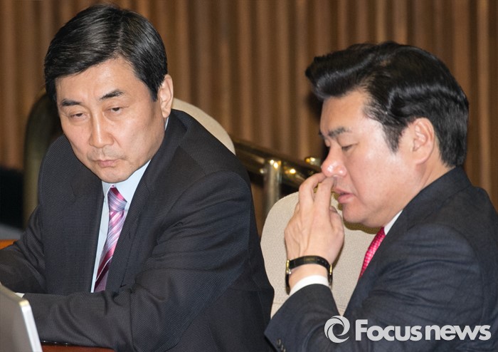(서울=포커스뉴스) 테러방지법 직권상정에 반발해 야당이 무제한 토론(필리버스터)를 일주일째 진행하며 약 140시간을 돌파한 29일 오후 서울 여의도 국회 본회의장에서 원유철(오른쪽) 새누리당 원내대표와 이종걸 더불어민주당 원내대표가 대화하고 있다.