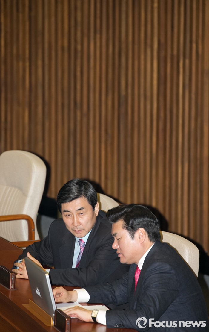 (서울=포커스뉴스) 테러방지법 직권상정에 반발해 야당이 무제한 토론(필리버스터)를 일주일째 진행하며 약 140시간을 돌파한 29일 오후 서울 여의도 국회 본회의장에서 원유철(오른쪽) 새누리당 원내대표와 이종걸 더불어민주당 원내대표가 대화하고 있다.