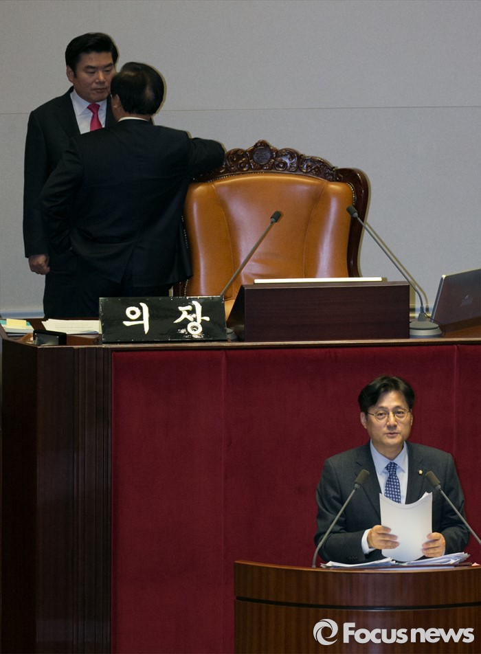 (서울=포커스뉴스) 테러방지법 직권상정에 반발해 야당이 무제한 토론(필리버스터)를 일주일째 진행하며 약 140시간을 돌파한 29일 오후 서울 여의도 국회 본회의장에서 토론에 참여한 홍익표 더불어민주당 의원 뒤로 정갑윤 국회 부의장과 원유철 새누리당 원내대표가 대화하고 있다.