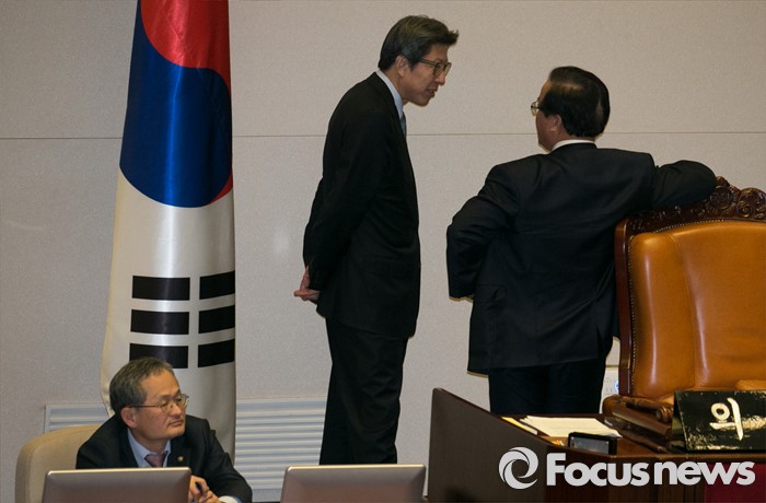 (서울=포커스뉴스) 테러방지법 직권상정에 반발해 야당이 무제한 토론(필리버스터)를 일주일째 진행하며 약 140시간을 돌파한 29일 오후 서울 여의도 국회 본회의장에서 정갑윤(오른쪽) 국회 부의장과 박형준 국회 사무총장이 대화하고 있다.