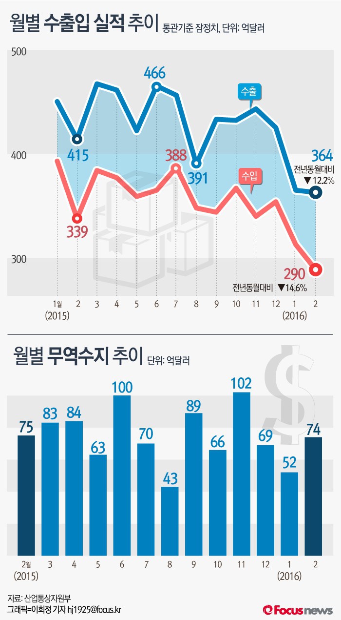 (서울=포커스뉴스) 산업통상자원부는 올해 2월 수출액이 전년 동월 대비 12.2% 줄어든 364억달러로 잠정 집계됐다고 1일 밝혔다. 수입액은 지난해 같은 기간보다 14.6% 줄어든 290억달러다. 무역수지는 74억달러 흑자로 2012년 2월 이후 49개월째 흑자 행진을 이어갔다.