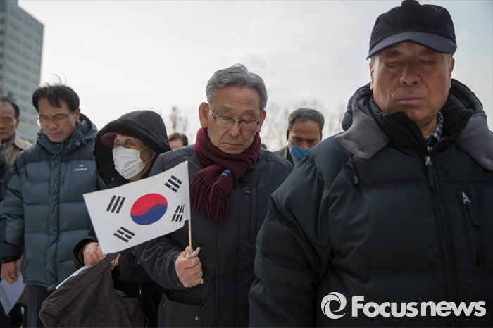 (서울=포커스뉴스) 1일 오후 서울 시청 앞 광장에서 열린 '북핵폐기 삼일절 국민대회 및 구국기도회'에 참석한 보수단체 회원들이 순국선열에 대한 묵념을 하고 있다.