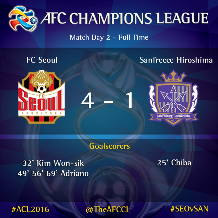 서울은 1일 서울 상암월드컵경기장에서 열린 히로시마와의 2016 아시아축구연맹(AFC) 챔피언스리그 조별라운드 F조 2차전 홈경기에서 4-1로 이겼다. 서울은 치바에게 선제골을 내줬지만 이후 4골을 몰아치며 역전승을 기록했다. 서울 외국인선수 아드리아노는 후반에만 3골을 집중해 1차전 부리람 유나이티드와의 원정경기에 이어 2경기 연속 해트트릭을 작성했다.