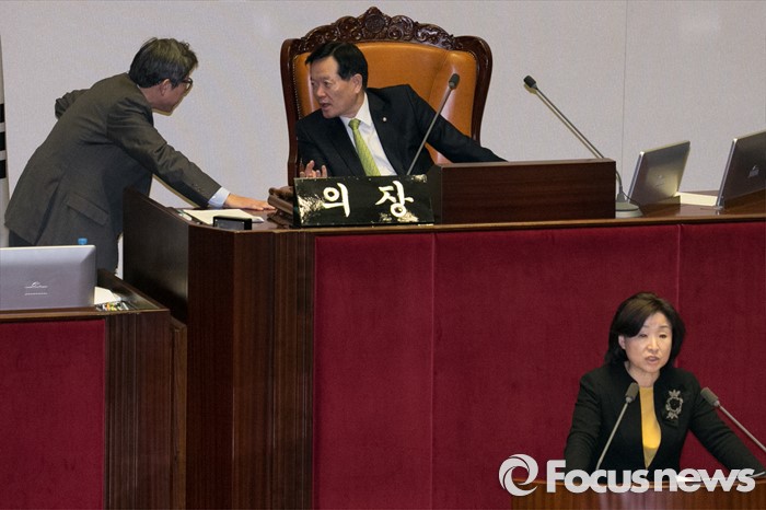 (서울=포커스뉴스) 정의화(가운데) 의장과 박형준(왼쪽) 사무청장이 2일 오전 서울 여의도 국회 본회의장에서 심상정 정의당 대표의 테러방지법 저지를 위한 무제한 토론(필리버스터)을 경청하며 대화하고 있다.