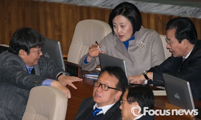 (서울=포커스뉴스) 테러방지법 직권상정에 반발해 야당이 세계 최장 기록의 필리버스터(무제한 토론)를 이어가고 있는 2일 오전 서울 여의도 국회 본회의장에서 이춘석(왼쪽부터) 더불어민주당 원내수석부대표, 박영선, 변재일 비대위원이 대화하고 있다. 야당은 이날 필리버스터를 중단하고 선거법 등을 처리할 예정이다.