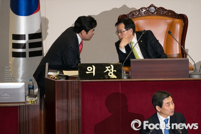 (서울=포커스뉴스) 테러방지법 직권상정에 반발해 야당이 세계 최장 기록의 필리버스터(무제한 토론)를 이어가고 있는 2일 오전 서울 여의도 국회 본회의장에서 토론에 참여한 이종걸(앞) 더불어민주당 원내대표의 발언 중에 정의화(뒤 오른쪽) 국회의장과 원유철 새누리당 원내대표가 대화하고 있다. 야당은 이날 필리버스터를 중단하고 선거법 등을 처리할 예정이다.