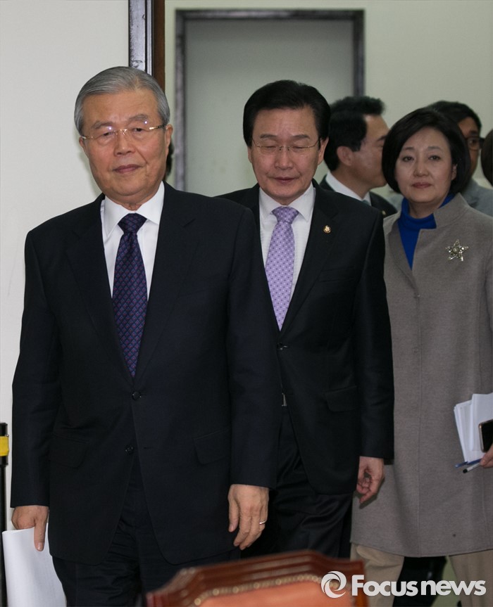 (서울=포커스뉴스) 김종인(왼쪽부터) 더불어민주당 비대위 대표, 변재일, 박영선 비대위원이 2일 오전 서울 여의도 국회에서 열린 비상대책위원회의에 참석하고 있다.