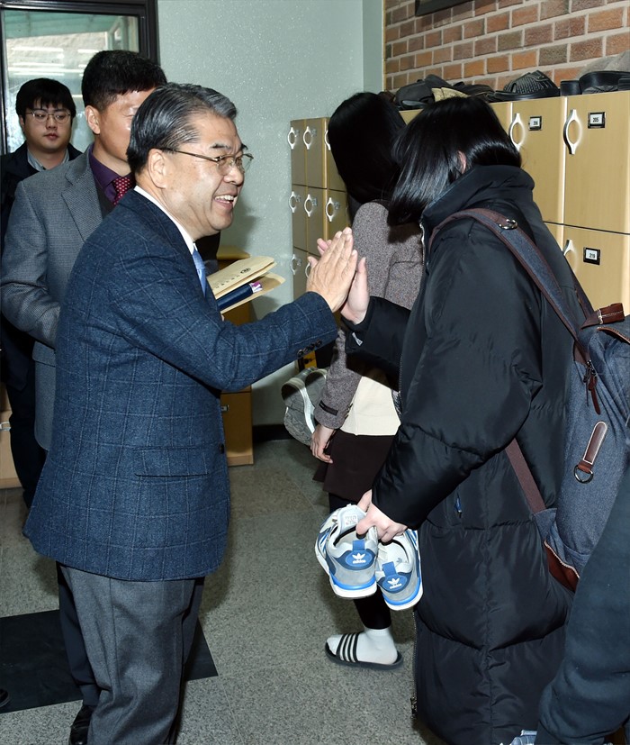 (서울=포커스뉴스) 교육 현장방문을 한 이재정 경기도교육감이 2일 오전 경기도 안산시 단원고등학교에서 학생들과 인사를 하고 있다. <사진제공=경기도교육청>
