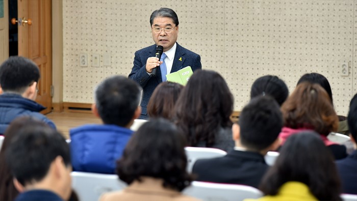 (서울=포커스뉴스) 교육 현장방문을 한 이재정 경기도교육감이 2일 오전 경기도 안산 단원고등학교에서 열린 교무회의에 참석해 인사말을 하고 있다. <사진제공=경기도교육청>
