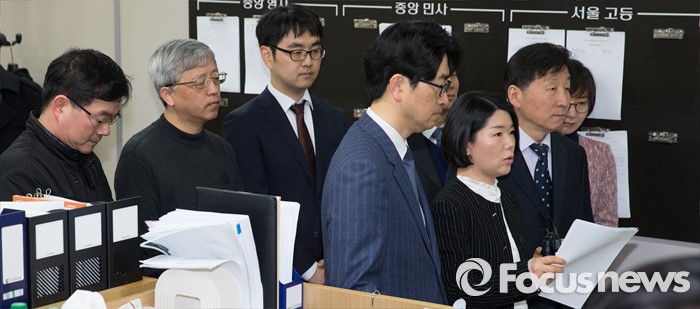 (서울=포커스뉴스) 2일 오전 서울 서초구 중앙지방법원 기자실에서 위은진(앞줄 왼쪽 두번째) 대한변호사협회 인권위원회 부위원장이 테러방지법안 의견서 사태에 관한 입장을 발표하고 있다.