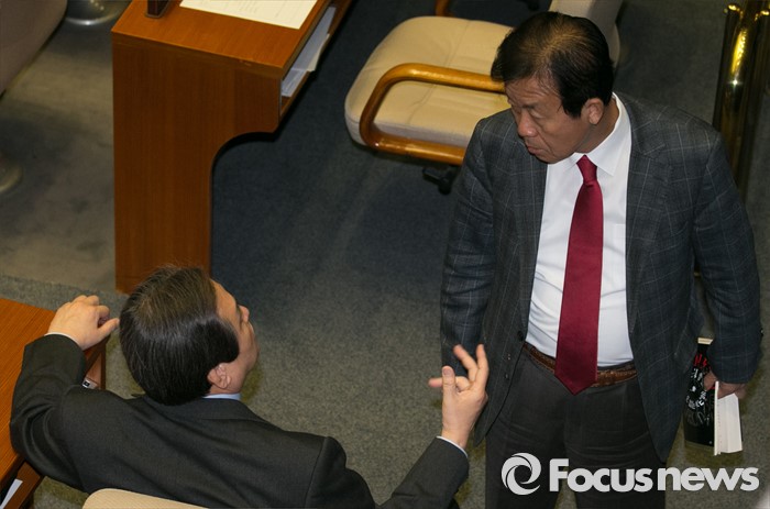 (서울=포커스뉴스) 테러방지법 직권상정에 반발해 야당이 세계 최장 기록의 필리버스터(무제한 토론)를 이어가고 있는 2일 오전 서울 여의도 국회 본회의장에서 김무성(왼쪽) 새누리당 대표와 원혜영 더불어민주당 의원이 대화하고 있다. 야당은 이날 필리버스터를 중단하고 선거법 등을 처리할 예정이다.