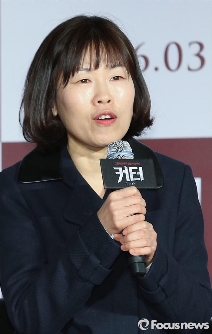 (서울=포커스뉴스) 2일 오전 서울 광진구 롯데시네마 건대입구점에서 열린 영화 '커터' 제작보고회에 참석한 영화감독 정희성이 인사말을 하고 있다.