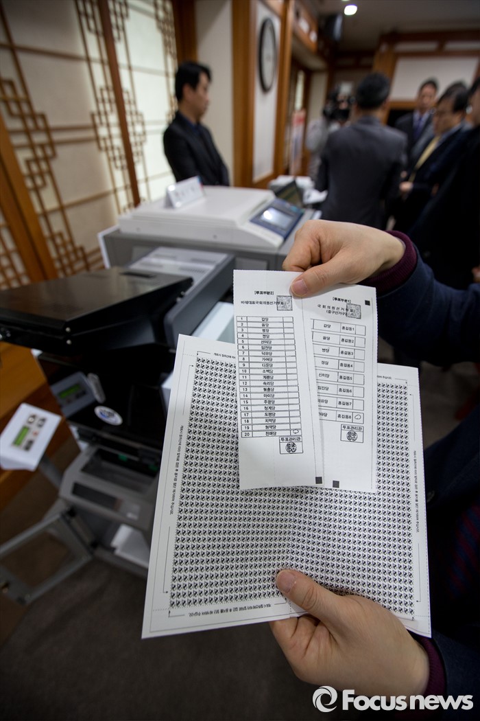 (과천=포커스뉴스) 2일 오전 경기도 과천시 중앙선거관리위원회에서 열린 '투표지분류기 및 선상투표 쉴드팩스 시연'에서 중앙선관위 직원이 선상투표에 사용될 투표용지를 견본을 선보이고 있다.
