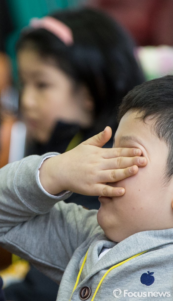(서울=포커스뉴스) 2일 오전 서울 이태원 초등학교에서 열린 2016학년도 입학식에 참석한 신입생이 눈을 비비고 있다.
