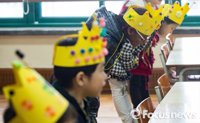 (서울=포커스뉴스) 2일 오전 서울 이태원 초등학교에서 열린 2016학년도 입학식에 참석한 어린이들이 인사를 배우고 있다.