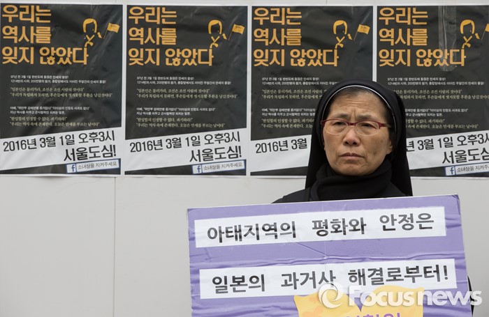 (서울=포커스뉴스) 2일 오후 서울 종로구 옛 주한일본대사관 앞에서 한국정신대문제대책협의회, 학생들을 비롯한 참석자들이 '제1220차 일본군 위안부 문제해결을 위한 정기 수요시위'를 하고 있다.