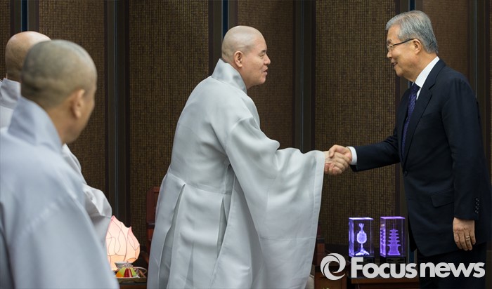 (서울=포커스뉴스) 2일 오후 서울 종로구 조계사를 찾은 김종인(맨 오른쪽) 더불어민주당 비상대책위원회 대표가 조계종 총무원장 자승 스님을 만나 악수하고 있다.