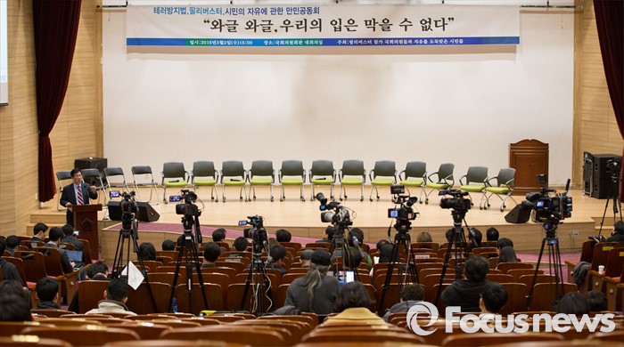 (서울=포커스뉴스) 2일 오후 서울 여의도 국회 의원회관에서 열린 테러방지법, 필리버스터, 시민의 자유에 관한 만민공동회 행사에서 신경민 더불어민주당 의원이 발언을 하고 있다.