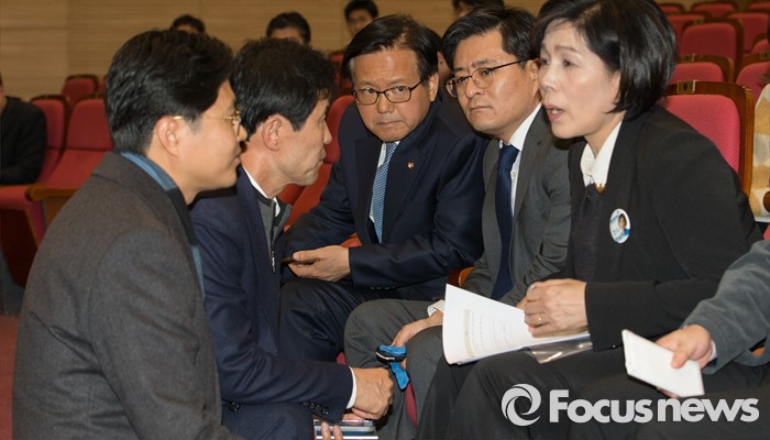 (서울=포커스뉴스) 2일 오후 서울 여의도 국회 의원회관에서 열린 테러방지법, 필리버스터, 시민의 자유에 관한 만민공동회 행사에서 필리버스터에 참여했던 야당 의원들이 행사 내용과 관련해 대화를 나누고 있다.