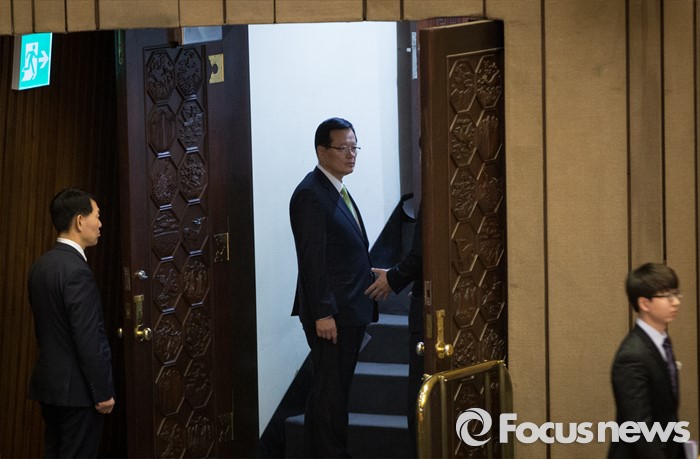 (서울=포커스뉴스) 테러방지법 직권상정에 반발해 야당이 세계 최장 기록의 필리버스터(무제한 토론)를 이어가고 있는 2일 오후, 서울 여의도 국회 본회의장에서 정의화 국회의장이 근무 교대를 한 후 회의장을 빠져 나가며 누군가와 대화하고 있다.