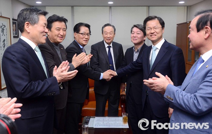 (서울=포커스뉴스) 국민의당 안철수(오른쪽 세번째), 천정배(오른쪽 두번째) 공동대표가 2일 오후 서울 여의도 국회 의원회관 박지원(왼쪽 세번째) 의원 집무실을 방문해, 박 의원과 회동 전 악수하고 있다. 왼쪽부터 주승용 원내대표, 김영환 공동선대위원장, 박 의원, 권노갑 전 더민주 상임고문, 안 공동대표, 천 공동대표.