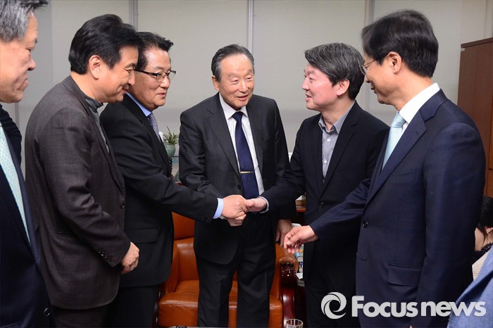 (서울=포커스뉴스) 국민의당 안철수(오른쪽 두번째), 천정배(오른쪽) 공동대표가 2일 오후 서울 여의도 국회 의원회관 무소속 박지원(왼쪽 세번째) 의원 집무실을 방문해, 박 의원과 회동 전 악수하고 있다. 왼쪽부터 주승용 원내대표, 김영환 공동선대위원장, 박 의원, 권노갑 전 더민주 상임고문, 안 공동대표, 천 공동대표.
