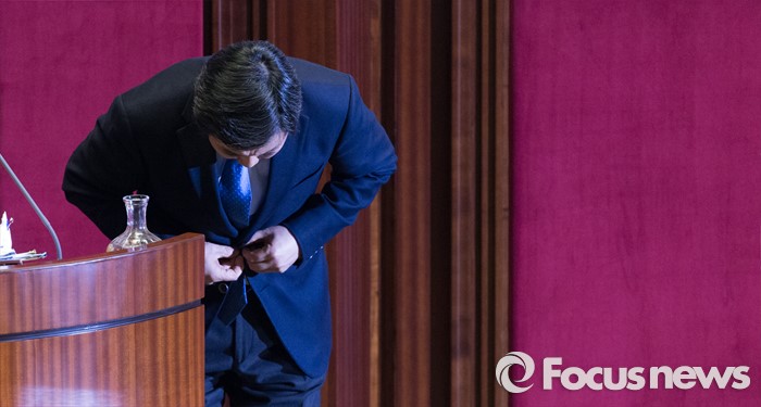 (서울=포커스뉴스) 테러방지법 직권상정에 반발해 야당이 세계 최장 기록의 필리버스터(무제한 토론)를 이어가고 있는 2일 오후 서울 여의도 국회 본회의장에서 토론에 참여한 이종걸 더불어민주당 원내대표가 12시간 31분 발언을 끝으로 무제한 토론을 중단하며 인사하고 있다.