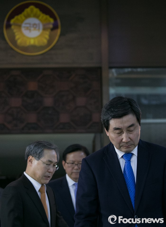 (서울=포커스뉴스) 테러방지법 직권상정에 반발해 야당이 세계 최장 기록의 필리버스터(무제한 토론)를 진행한 2일 오후 서울 여의도 국회에서 마지막 주자로 나섰던 이종걸(오른쪽) 더불어민주당 원내대표가 취재진 질문에 답하기 위해 이동하고 있다. 마지막 주자로 나선 이 원내대표는 이날 정청래 의원의 기록인 11시간 40분을 경신한 12시간 31분을 기록하며 토론을 마쳤으며, 야당의 필리버스터는 약 193시간만에 종료됐다.