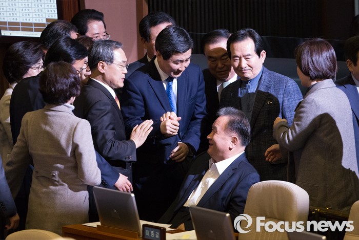 (서울=포커스뉴스) 테러방지법 직권상정에 반발해 야당이 세계 최장 기록의 필리버스터(무제한 토론)를 진행한 2일 오후 서울 여의도 국회 본회의장에서 마지막 주자인 이종걸 더불어민주당 원내대표가 토론을 마친 뒤 동료 의원들의 격려를 받으며 퇴장하고 있다. 마지막 주자로 나선 이 원내대표는 이날 정청래 의원의 기록인 11시간 40분을 경신한 12시간 31분을 기록하며 토론을 마쳤으며, 야당의 필리버스터는 약 193시간만에 종료됐다.