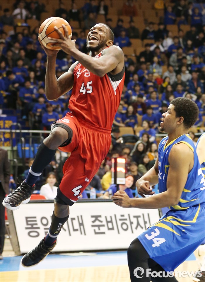 (서울=포커스뉴스) 2일 서울 잠실실내체육관에서 열린 2015-2016 프로농구 삼성-KGC 6강플레이오프 4차전에서 KGC 마리오 리틀이 삼성 에릭 와이즈를 제치며 레이업슛을 시도하고 있다.